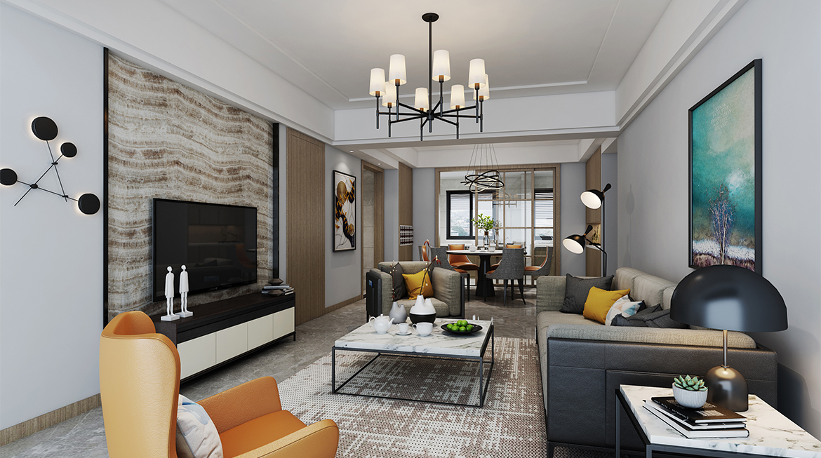 細(xì)膩的皮革面料,質(zhì)樸雅致的布藝,幾何形制家具,帶有肌理感大理石電視背景墻與交雜錯落地毯相融合。具有創(chuàng)意性燈具,高折射的光亮感,不但提升了整個空間的品質(zhì)感,豐富了空間材質(zhì)的層次感。