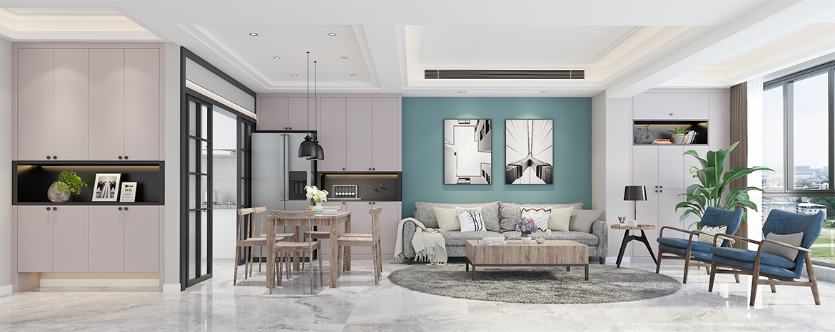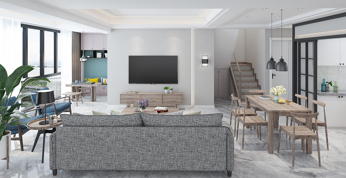 ① 設(shè)計(jì)師規(guī)劃了空間布局和動(dòng)線,客廳、餐廳融為一體;空間變得靈動(dòng)、通透。